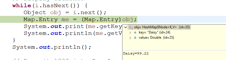 I was wondering that in line 7 the coder has done i.next() which returns java.lang.Object which has been cast to Map.Entry type.Remember in line 7 me variable has pointer to the keys of map that had been defined in earlier lines.