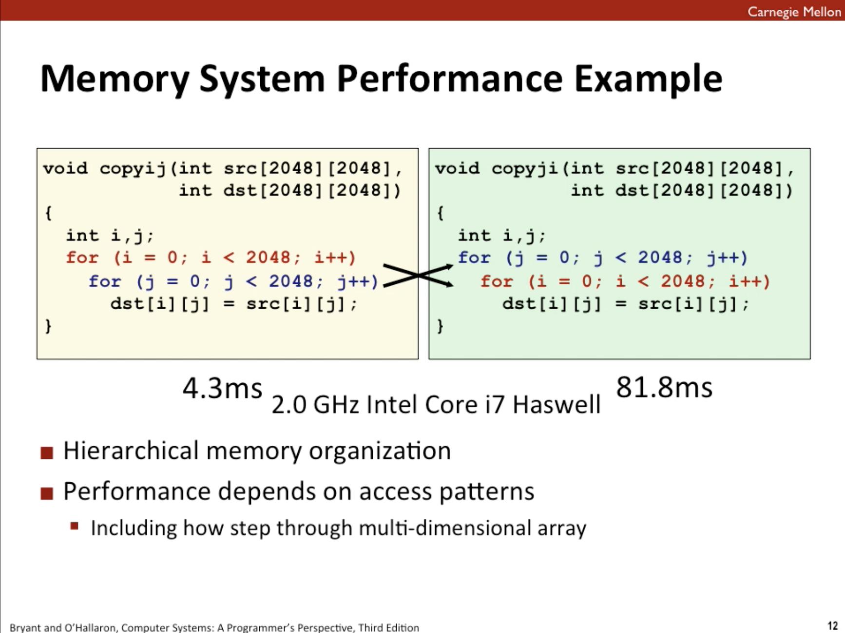 See how you jump back and forth in the second variant? When the arrays are larger, this will make the CPU need to fetch data from memory more often, since it’s no longer possible to fit it all into the cache. More memory access leads to lower efficiency and longer execution times.