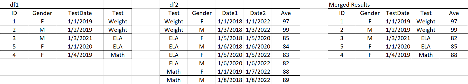 genderandTest TestDatein df1 need to be withinDate1andDate2from df2- all.x=T (keep df1 records)