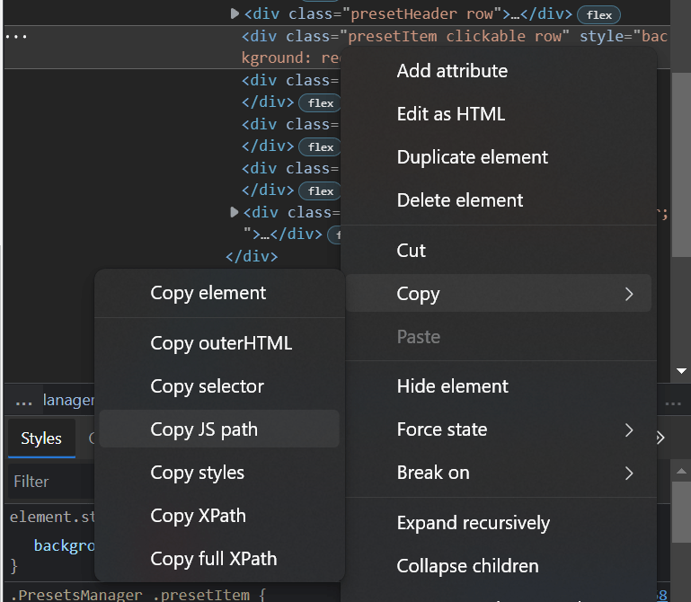 - Inside the element console right click on the specific element, go to copy and copy js path: