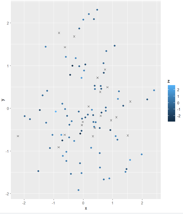 geom_point(data= subset(df, is.na(z)), mapping= aes(x, y), col= "black", shape= 4)