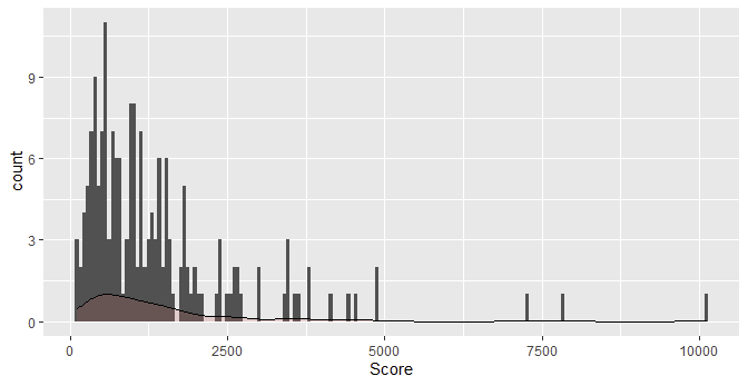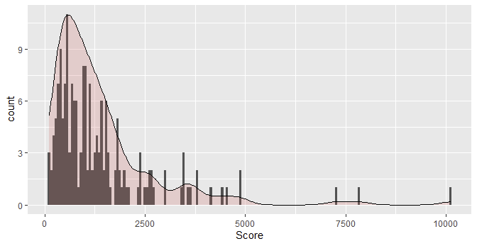 ggplot(df, aes(x=Score)) + geom_histogram( aes(y = after_stat(count), color=Enroll, fill=Enroll), bins = 177) + geom_density(aes(y = after_stat(count / max(count))), alpha=.2, fill="#FF6666") -