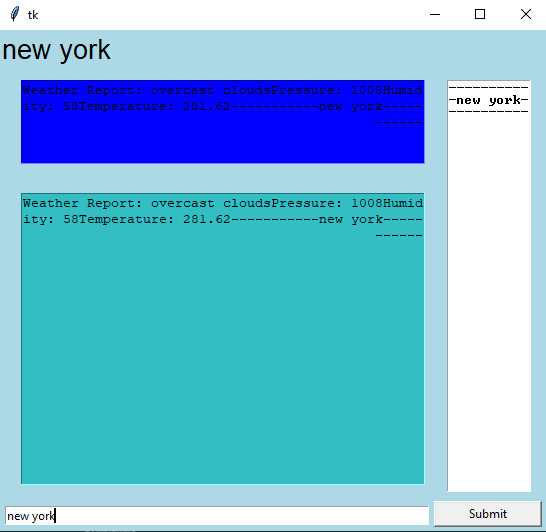 I’m creating a python weather app with the tkinter UI library, It works but using the Open weather map API. The user will input a city name (CITY var) and using a predefined link body the program plugs in the city name (CITY var) and requests the city’s weather data from the open weather map site using that link. The whole process of requesting the data is handled by this function