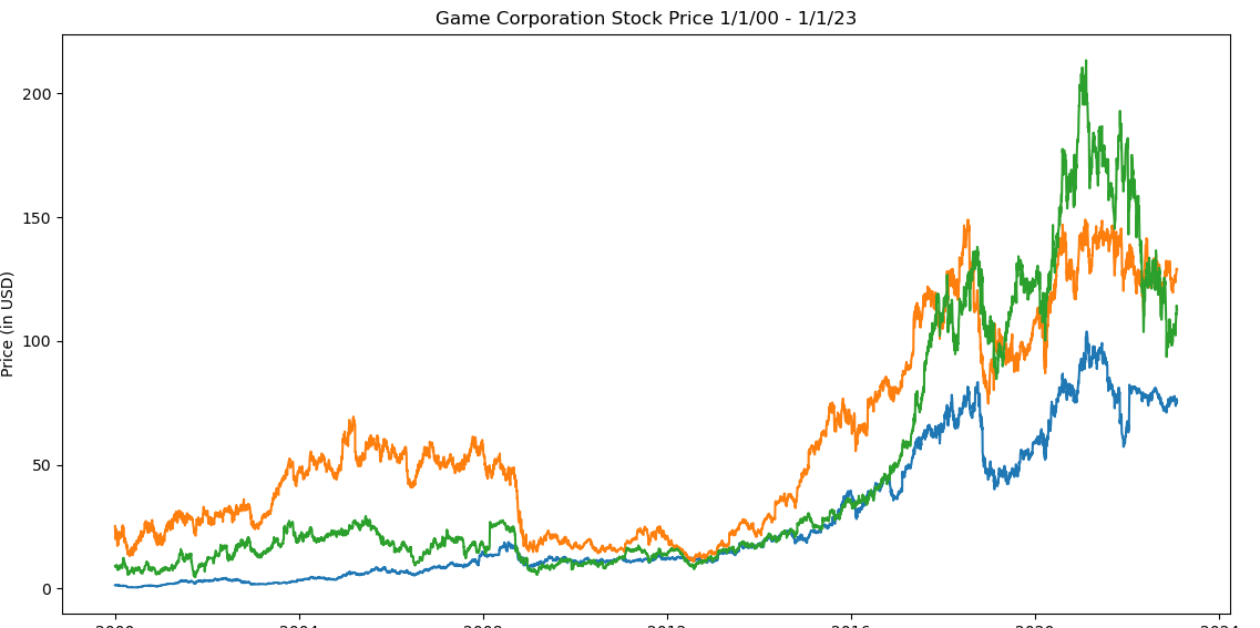 plt.title("Game Corporation Stock Price 1/1/00 - 1/1/23")