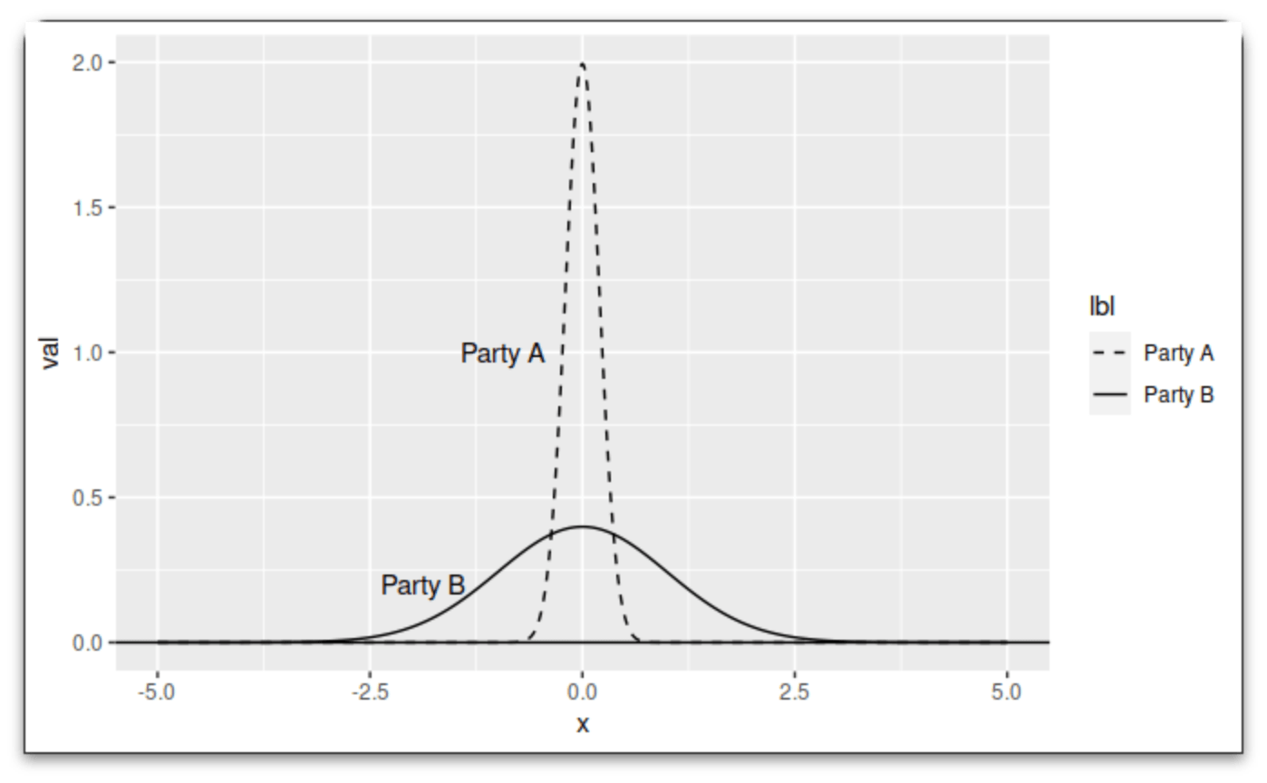 I am trying to add the legend showing that the dashed line is the distribution of party A and the solid line is the distribution of party B. How can I add the legend?