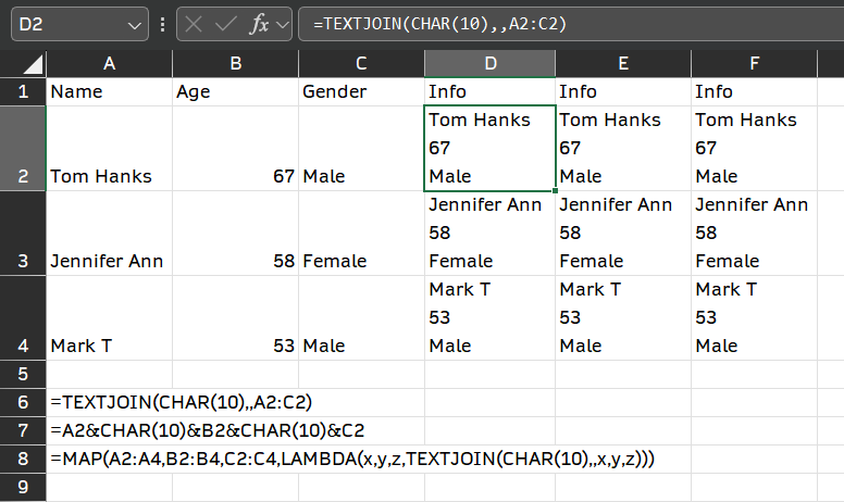 =MAP(A2:A4,B2:B4,C2:C4,LAMBDA(x,y,z,TEXTJOIN(CHAR(10),,x,y,z)))