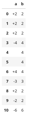 'a': [2, 2, 2, -4, np.nan, np.nan, 4, -3, 2, -2, -6],