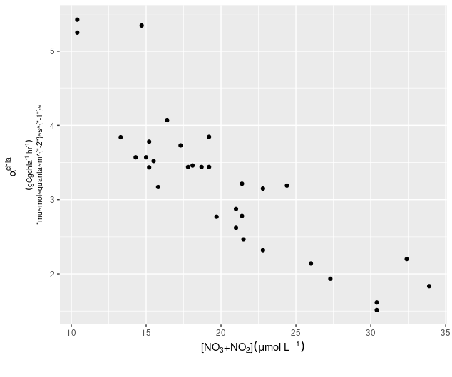 ylab(bquote('\u03b1 '^{"chla"}~'\n(g C g chla'^{"-1"}~'hr'^{"-1"}~'/ ' *mu~ 'mol quanta' ~m^{"-2"}~'s'^{"-1"}~')'))