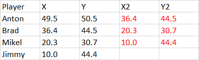 How can I add the values from column X and Y to X2 and Y2 using pandas dataframework? For example I want the X and Y value of Brad to be added into the X2 and Y2 column of Anton and for Mikel to be added to X2 and Y2 of Brad and so on till the end.