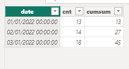 In PowerBI, I want to create a calculated table from table t. Using DAX, how can I write the equivalent of the following SQL query. Basically, here I am finding running sum (cumsum) using cnt ordered by date.