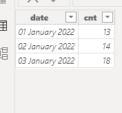 SUMMARIZE(Table1, Table1[date], Table1[cnt]),