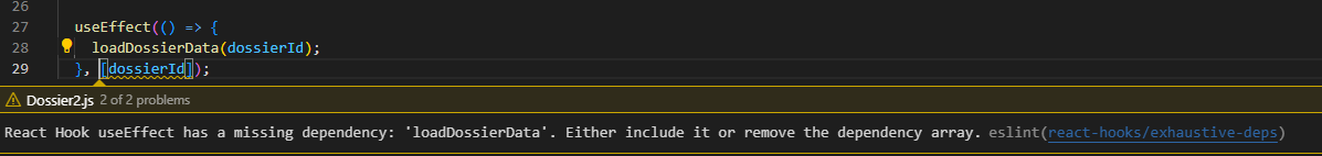 But the real problem comes here. In the initial call to the function, where I try to detect any dossierId change, the useEffect is warning me about a missing dependency: