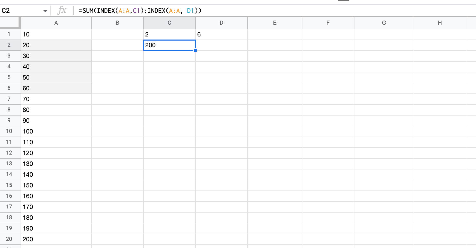 =SUM(INDEX(A:A,C1):INDEX(A:A, D1))