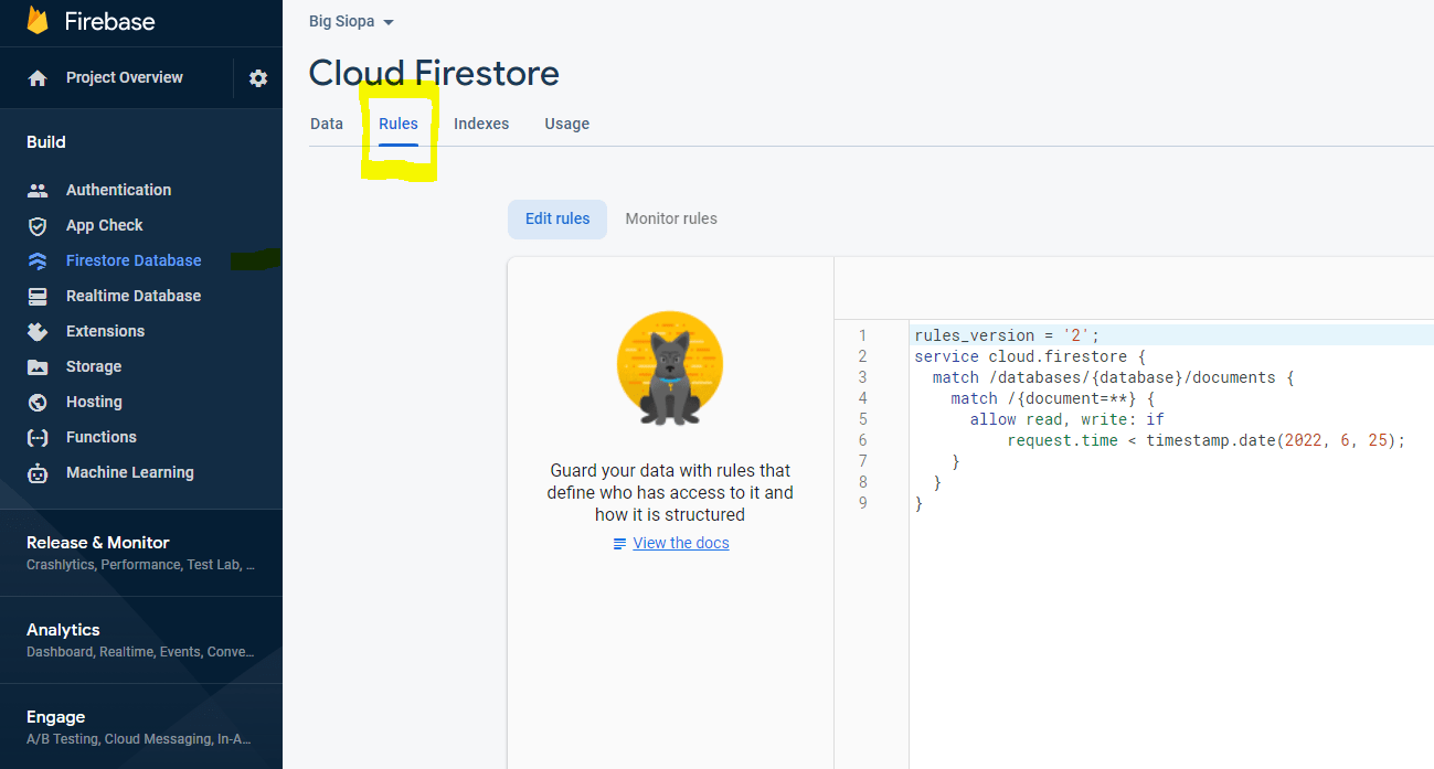 I am reading the documentation, but it’s going over my head. I just want to start by understanding where I find the Firestore rules first of all. I am in my Firebase project and in the "Firestore Database" section, but there is only a "Create atabase" button.