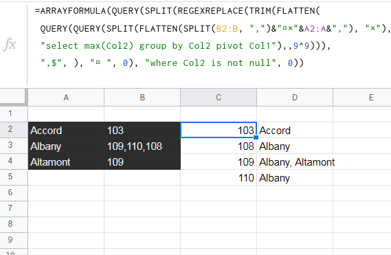 QUERY(QUERY(SPLIT(FLATTEN(SPLIT(B2:B, ",")&"¤×"&A2:A&","), "×"),