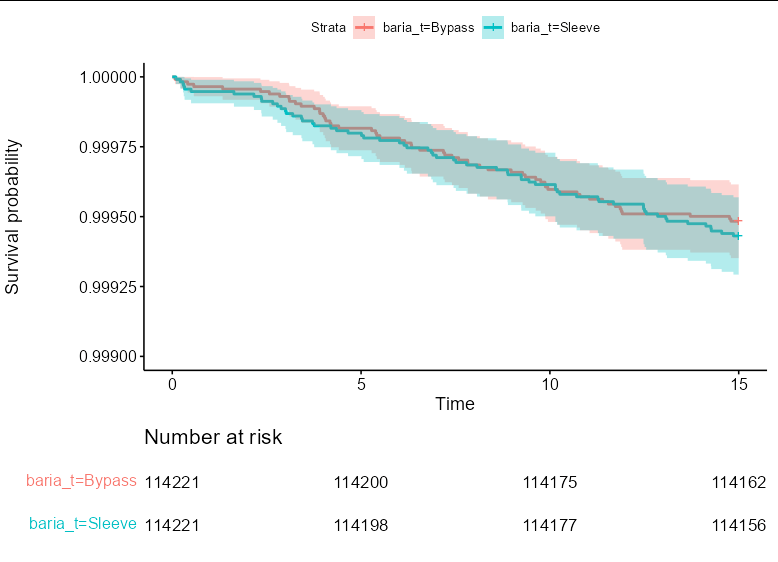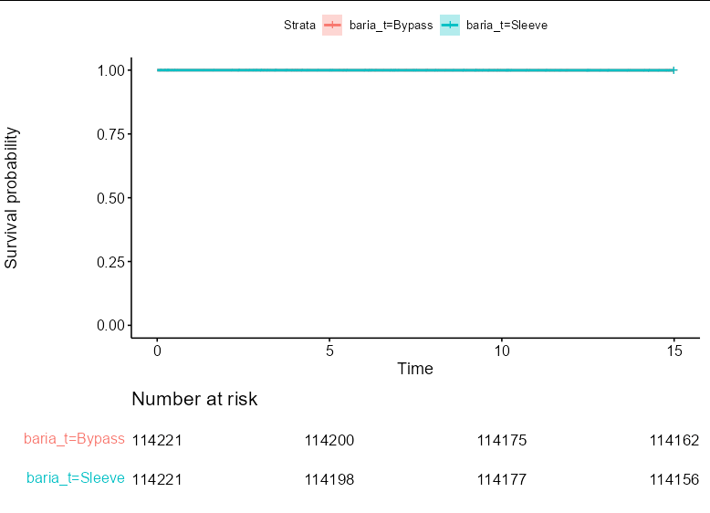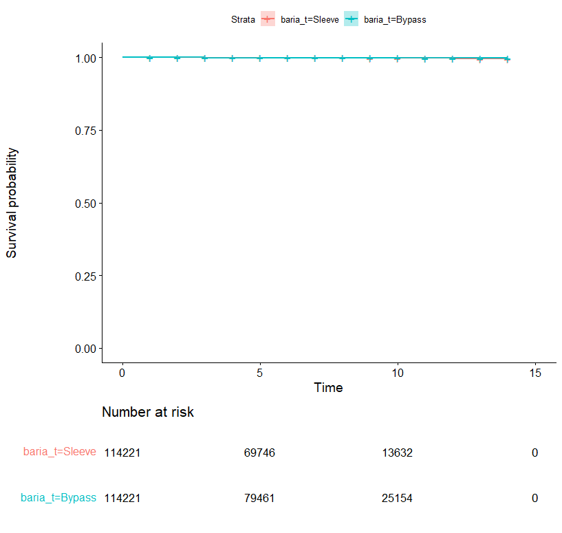fit.obj<-survfit(Surv(duree_suivi,k_oesogastr) ~ baria_t, data = pts_raw_matched)