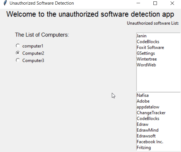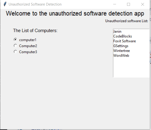 Label(text="Welcome to the unauthorized software detection app", font=("Roboto", 15)).pack()
