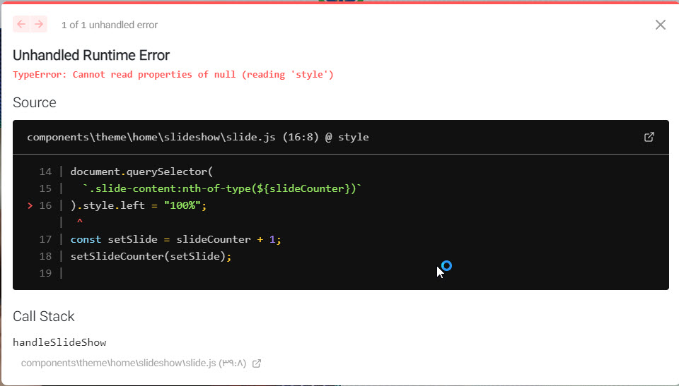 I created a slideshow in the Nextjs project, But I have a bug. When the user clicks on a link and the page has changed I get an Unhandled Runtime Error and I know it because of the setTimeout function it calls a function and tries to style an element that does not exist on the new page.