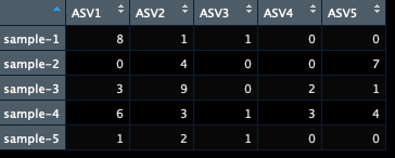 structure(list(ASV1 = c(8L, 0L, 3L, 6L, 1L), ASV2 = c(1L, 4L,