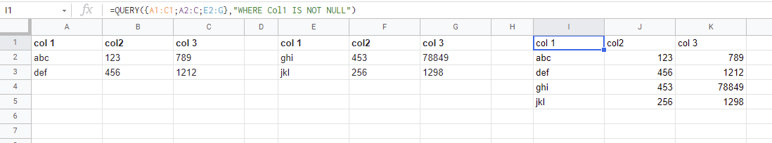 =QUERY({A1:C1;A2:C;E2:G},"WHERE Col1 IS NOT NULL")
