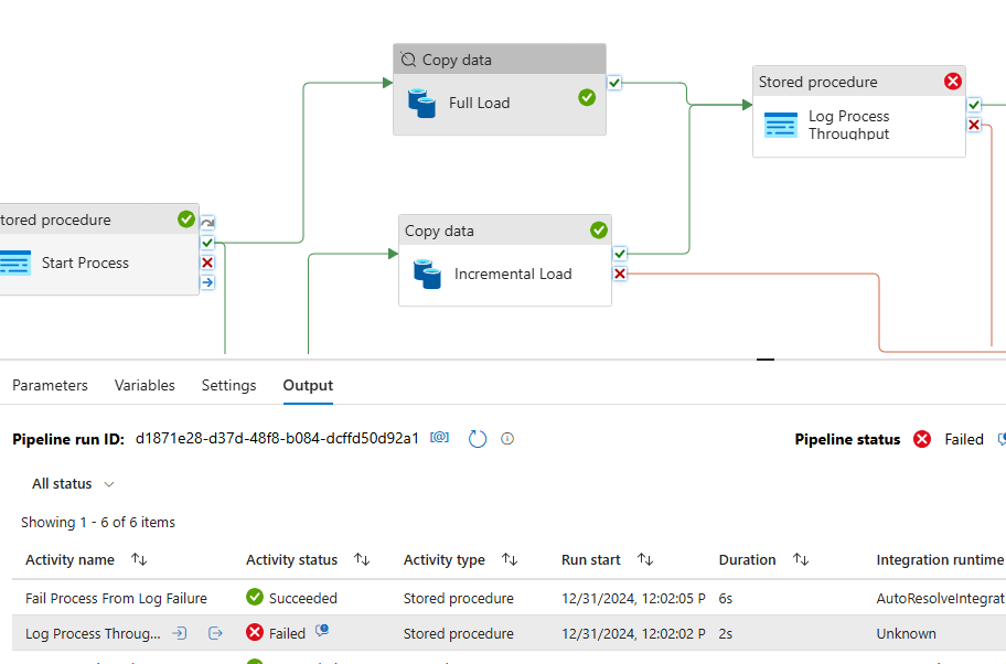 As a result of the ‘Full Load’ activity being de-activated, the Stored Procedure ‘Log Process Throughput’ is failing with the following error: