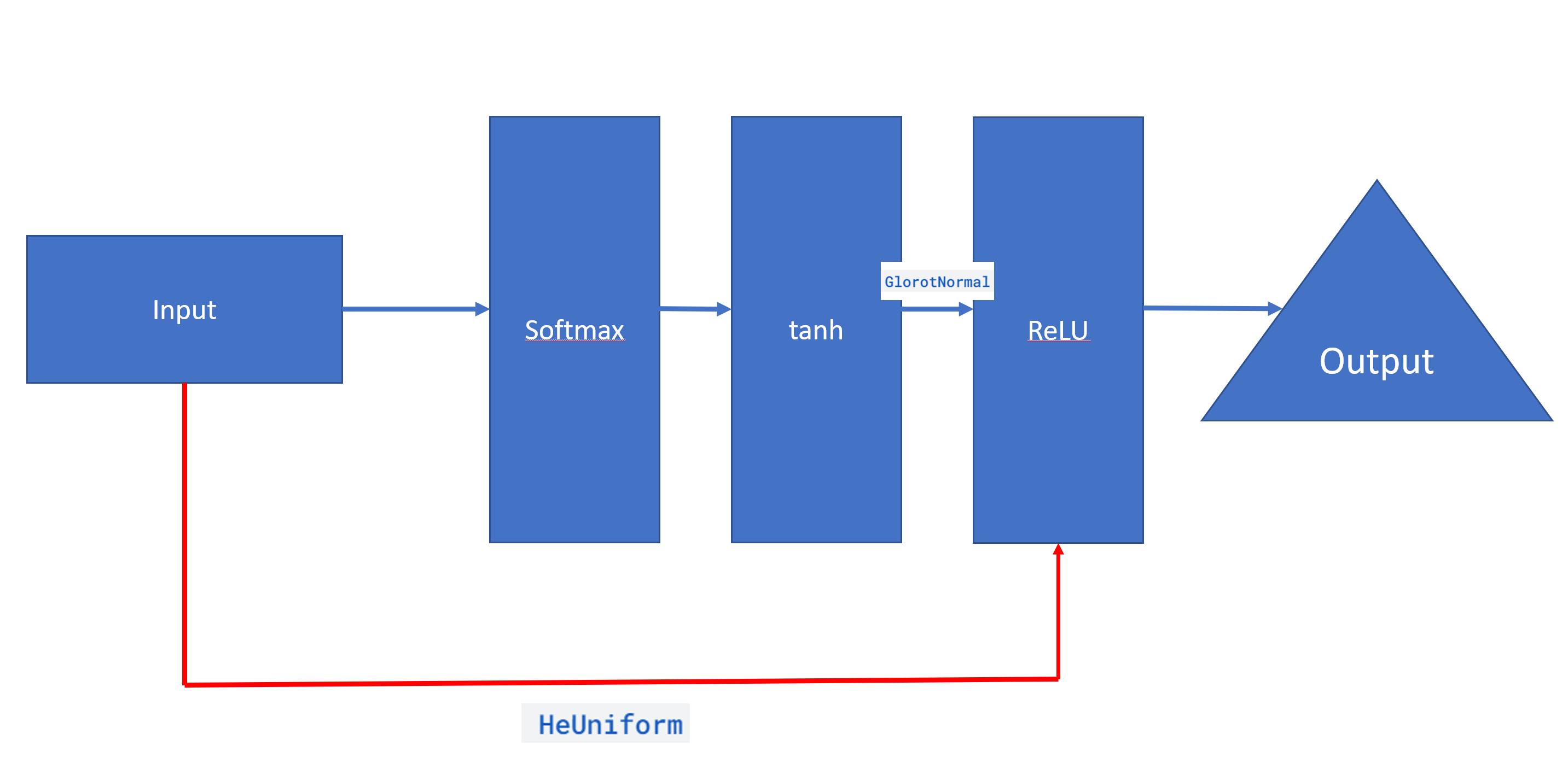 Is there a way that the first layer having the input values can have an extra connection to the third layer that has the ReLU activation? While doing so, I’d like to have different constraints in each connection. For example, for the connection coming from the previous layer, I’d like to use GlorotNormal as my weight initialization. As for the extra connection coming from the input layer, I’d like to use HeUniform initialization.