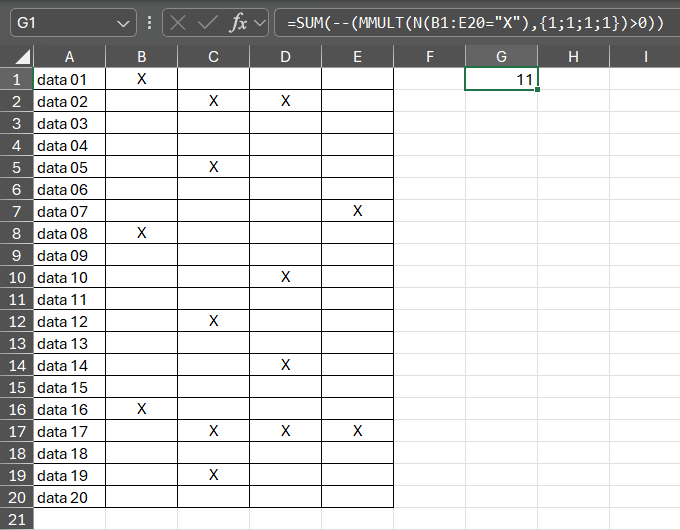 =SUM(--(MMULT(N((B1:E20="X")*(A1:A20<>"")),{1;1;1;1})>0))