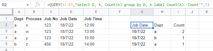 As the formula counts the number of occurrences of a value in only one column, how should I modify it to include multiple columns? Say, including Job Date?