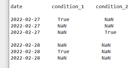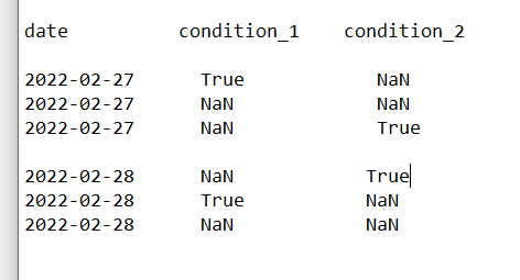 "condition_1" : ["True", "NaN", "NaN", "NaN", "True", "NaN"],
