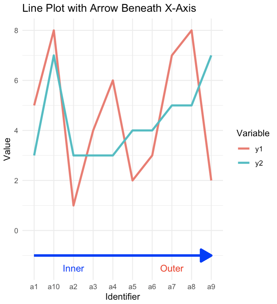 I’m trying to create a plot in ggplot2 with an arrow line pointing outward, and positioned beneath the x-axis. I used geom_segment function in ggplot2, but its drawing over the plot. I’m want this line with an arrow pointing to the right, positioned below the x-axis, labeled inner left side and outer right side to signify something like an "inner" section.