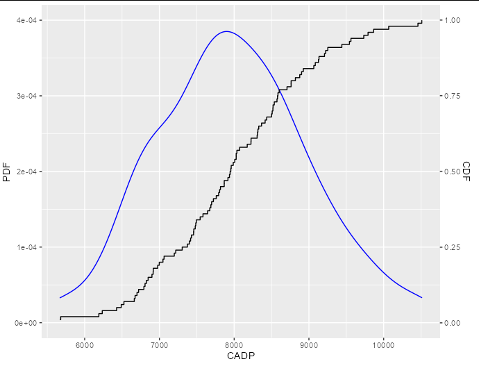 I want to plot a picture with cumulative distribution function (CDF) and probability density function (PDF),which has a unified x-axis and y-axis with respective scale range on the left and right sides. I tried using the sec_axis() in ggplot2, but PR can only draw one line, and the Y-axis of the other line is invalid. What should I do?