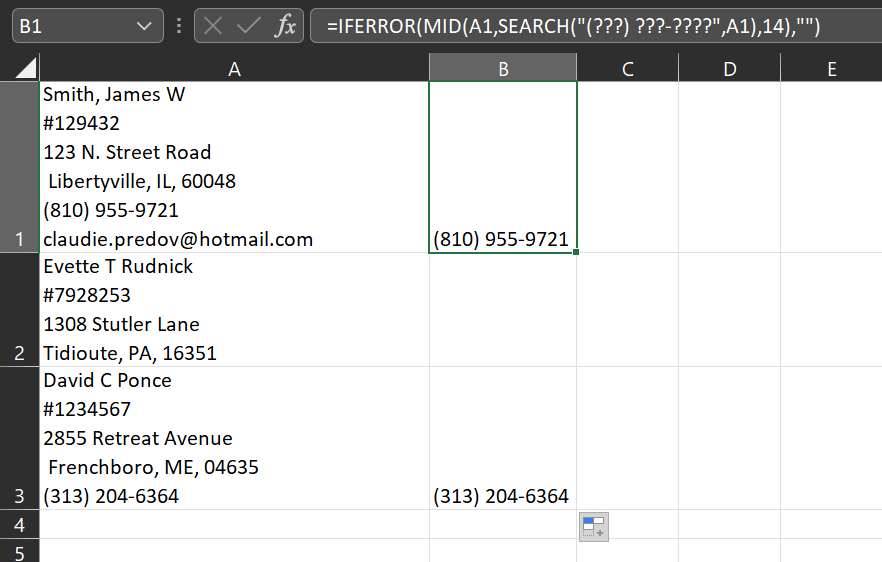 Example of cells below. As you can see some cells have more info like emails, and some don’t have a number but they’re all in the same column.