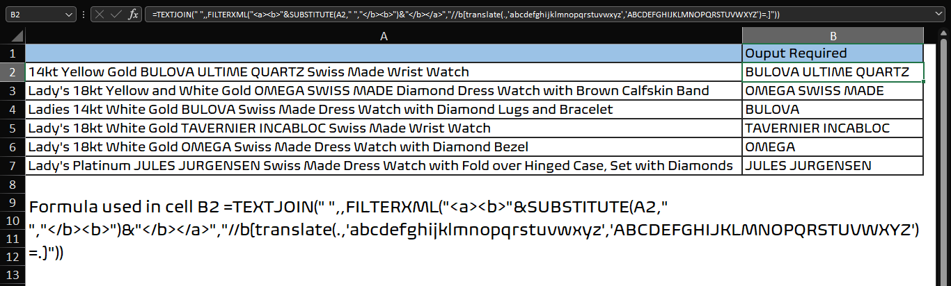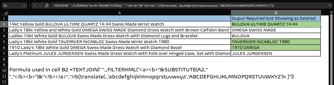 How to extract the capitalized full words from a string in excel ? Refer the first Image, I have used the following formula to extract the CAPITAL / BLOCK LETTER WORDS From a string in a cell, it works perfectly,