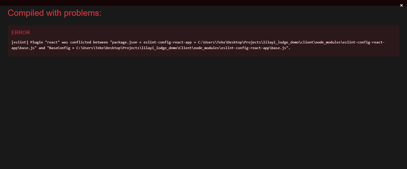[eslint] Plugin "react" was conflicted between "package.json » eslint-config-react-app » C:\Users\Teke\Desktop\Projects\lilayi_lodge_demo\client\node_modules\eslint-config-react-app\base.js" and "BaseConfig » C:\Users\Teke\Desktop\Projects\lilayi_lodge_demo\Client\node_modules\eslint-config-react-app\base.js".