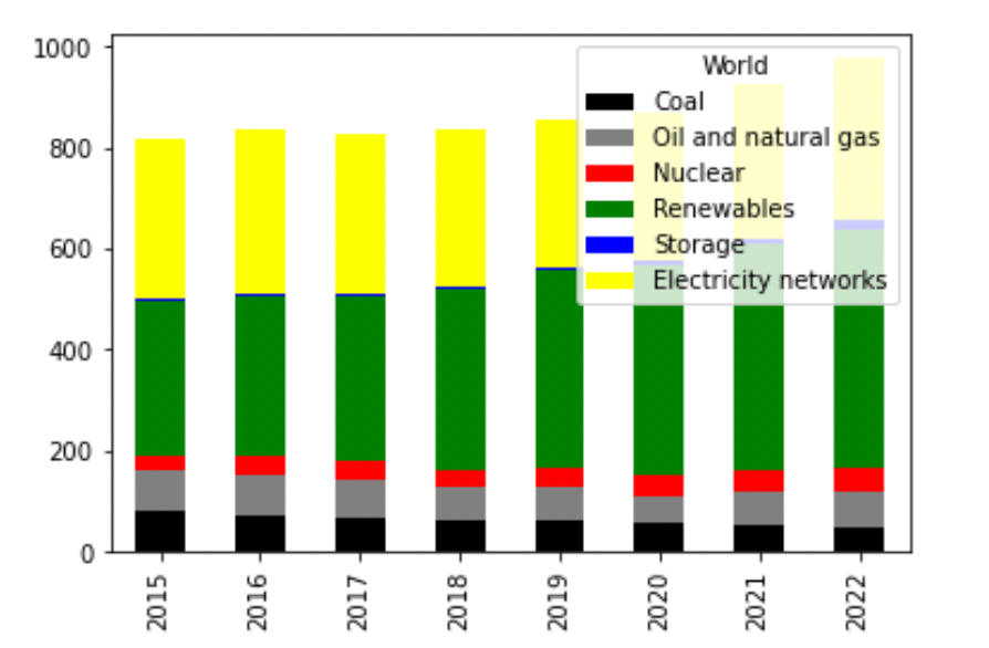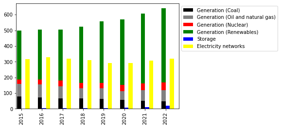 However, I’d like to have three separate bars for Generation, Storage and Electricity Networks. Generation here refers to data for Coal, Oil and natural gas, Nuclear and Renewables. How am I able to do it using matplotlib in Python?