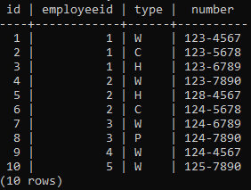 I am learning SQL using Postgres. Here I want to get the employeeID where the employee does not have any cell phone, type ‘C’, that is the answer should be 3, 4, 5 because those employees don’t have cell phone. I tried the following query but it doesn’t give me the right answer instead it gives me 1, 2, 3, 4, 5