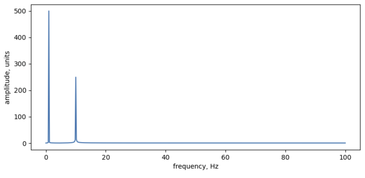 I would have expected the peak at 1Hz to have an amplitude of 1, and the peak at 10 to have an amplitude of 0.5 given my original signal. I’m having a factor of 500 off however looking at the values I’m getting on the plot – from where this factor is coming and how can I recover the original amplitudes?