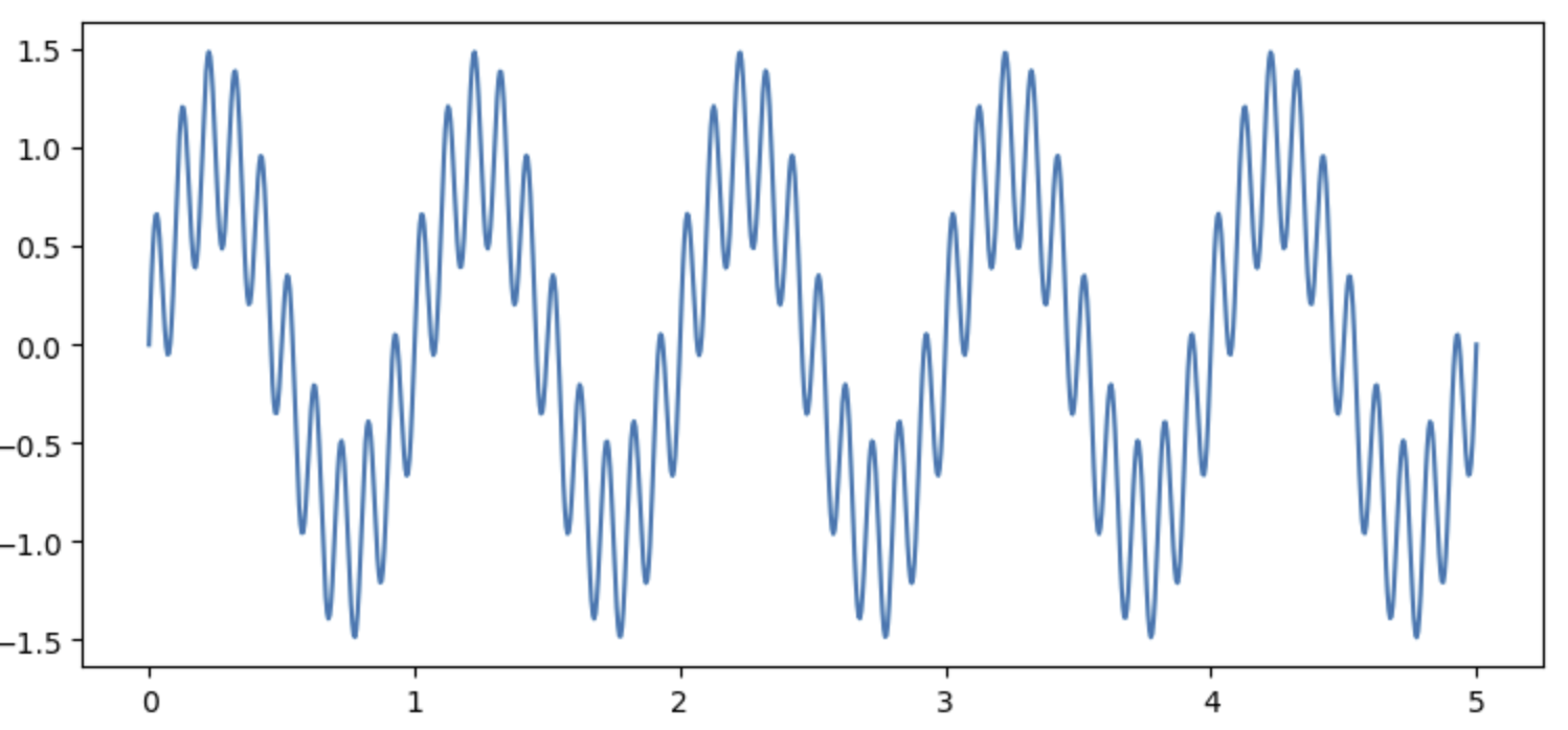 signal = np.sin(2 * np.pi * 1 * t) + 0.5 * np.sin(2 * np.pi * 10 * t)
