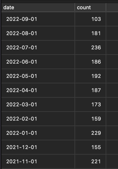 select date_trunc('month', inserted_at)::date as date, count(id) from users group by date order by date desc;