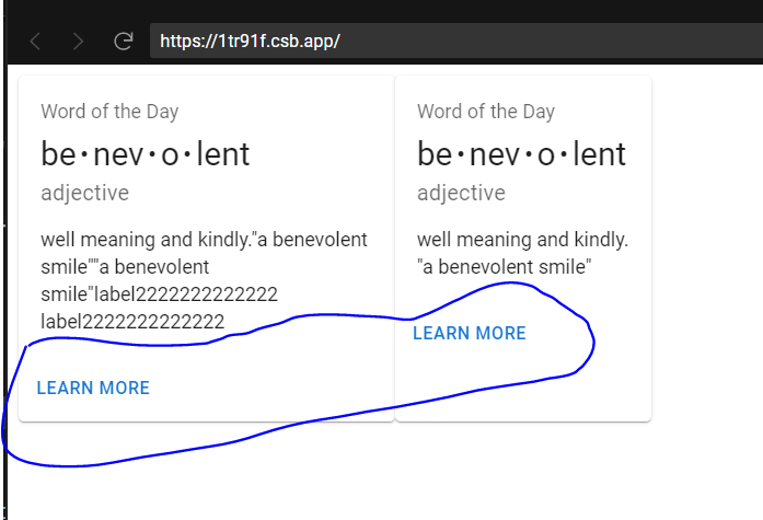 i want that when i am running map on my mui card, few cards have more text content so they card length increase and other cards as well. but the texts inside cards dont stay equal to each other. i am attaching the screenshot of my actual app and codesandbox example as well.i am not getting exact results on google. i made a dummy example on codesandbox please look at the codesandbox example and i am also attaching my genuine app shot. if u help me to fix codesandbox then i will apply same logic in my genuine code. Note: i am using grids in my genuine code. Thanks