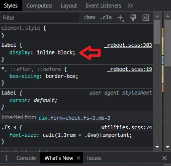 Bootstrap’s _reset.scss file sets label { display: inline-block; } by default, as you can see in the screenshot below.