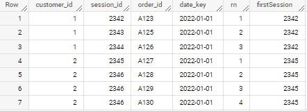 | customer_id | session_id | order_id | date_key | rn | firstSession |