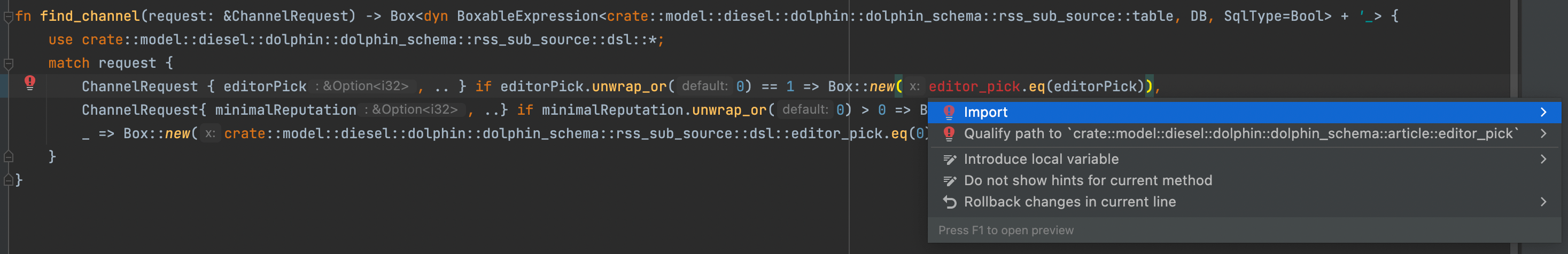 Now I want to make the code more shorter, and remove crate::model::diesel::dolphin::dolphin_schema::rss_sub_source::dsl:: and want to let the editor_pick to use local function import command. To my surprise, the IDE still tell me to import the crate::model::diesel::dolphin::dolphin_schema::rss_sub_source::dsl::, why still need import even through imported in the function? what should I to to remove the package path from the code and make the code more shorter and cleaner? is it possible to remove the package path from code? This is the intellij tips from IDE: