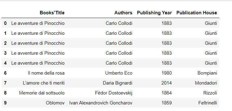 new_row = ['Le avventure di Pinocchio', 'Carlo Collodi', 1883, 'Giunti']
