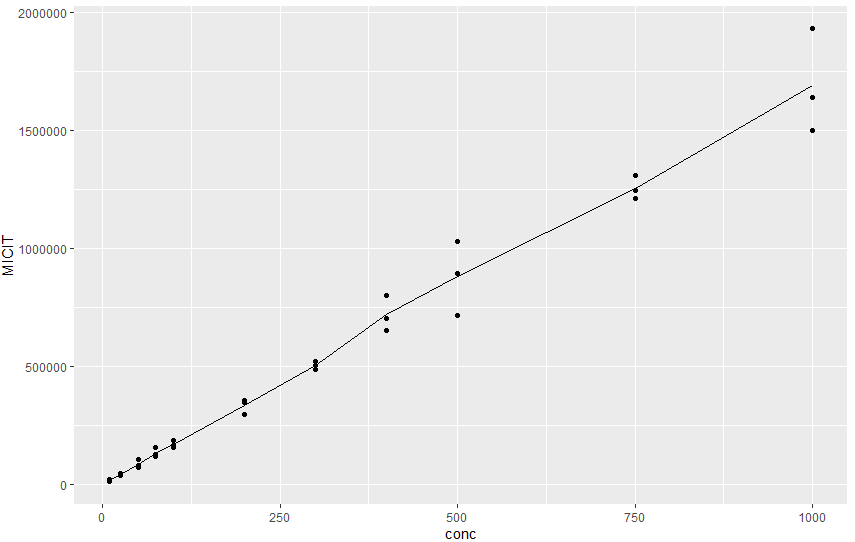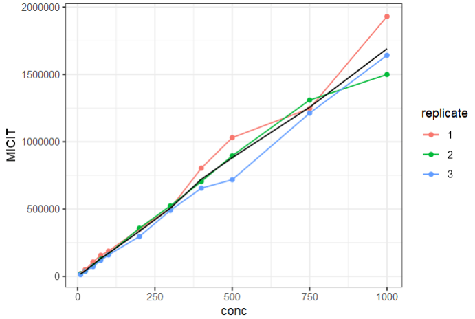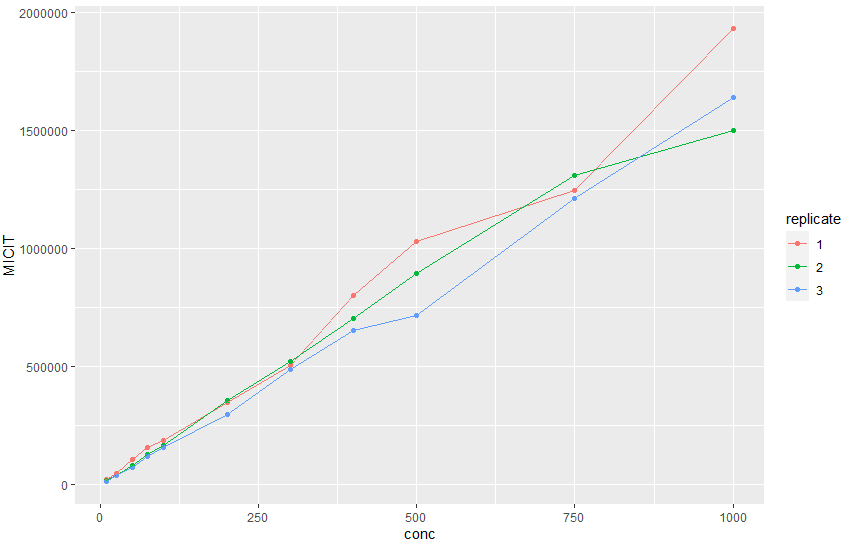 ggplot(xx, aes(conc, MICIT, colour = replicate)) +
