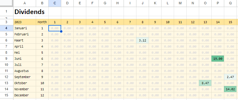 Dividend payments are marked in column C as Div, interest payments as Int: