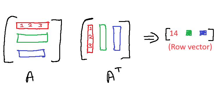 I need to multiply each row with a column at the corresponding row-index. Consider the graphics below in which I have a 3 x 3 matrix. The required operation is to multiply the row[0] of matrix with col[0] of transposed_matrix, row[1] of matrix with col[1] of transposed_matrix, and so on.