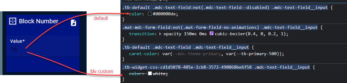 I am using a widget from Thingsboard’s library to update a shared attribute value. The widget allows for customization through the settings, but I am only able to update the background and title colors. The default black text color in the editable text box is not easily visible due to my chosen dark blue color scheme. I need to update the properties so that the text inside the text box is white.