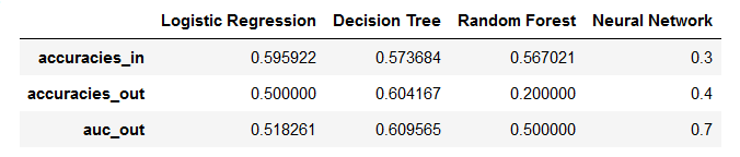 The first group (first row – accuracy_in) will contain four bars – accuracies_in for Logistic Regression, Decision Tree, Random Forest and Neural Network. Second group of bars will contain again four bars but this time for second row – accuracies_out. And lastly – the third group of bars will contain four bars with auc_out in each of them.