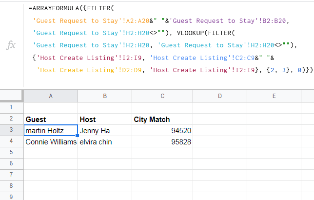 So this is a googlesheet i made it, its basically like match making spreadsheet, the tab to look at is Host Create Listing and Guest Request to Stay, so i just need able to match the Guest and the host those who are having the common post code in them.
